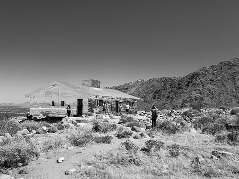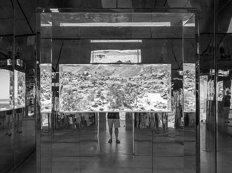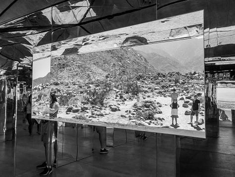 I was very fortunate to be in Palm Springs in 2017 while the inaugural Desert X art exhibit was taking place. I was most excited to see an installation titled Mirage by the artist Doug Aitken. In the tradition of land art reflecting American West aspirations, Mirage featured a mirror-clad, ranch-style house that continuously blurred boundaries between interior and exterior, subject and object. The installation created a visual echo chamber, absorbing and reflecting the surrounding landscape, causing the structure to seemingly vanish and transform its environment.