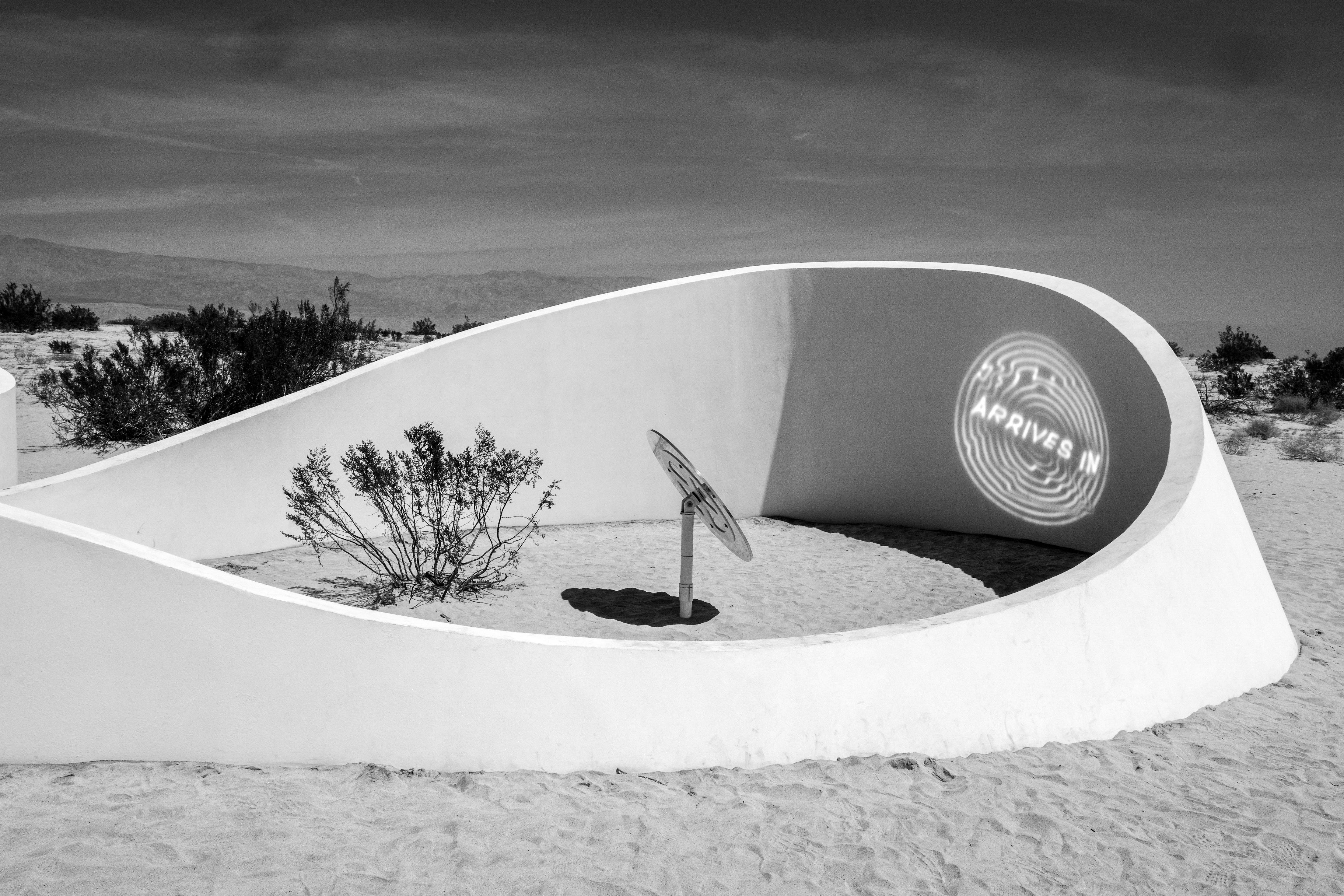 In Truth Arrives in Slanted Beams, Sarah Meyohas’ immersive installation merges analog and digital techniques to explore the systems shaping contemporary society by transforming natural caustic light patterns, typically seen at the bottom of a swimming pool, into an artful experience. Using innovative light-shaping technology, visitors can project sunlight onto a ribbon-like structure that cascades across the desert floor, evoking ancient sundials and nodding to 20th-century land art. Each mirrored panel, uniquely crafted by computer algorithms to manipulate light, spells out the poetic phrase “truth arrives in slanted beams,” blending technology with the sublime to create a captivating interplay of nature and art.