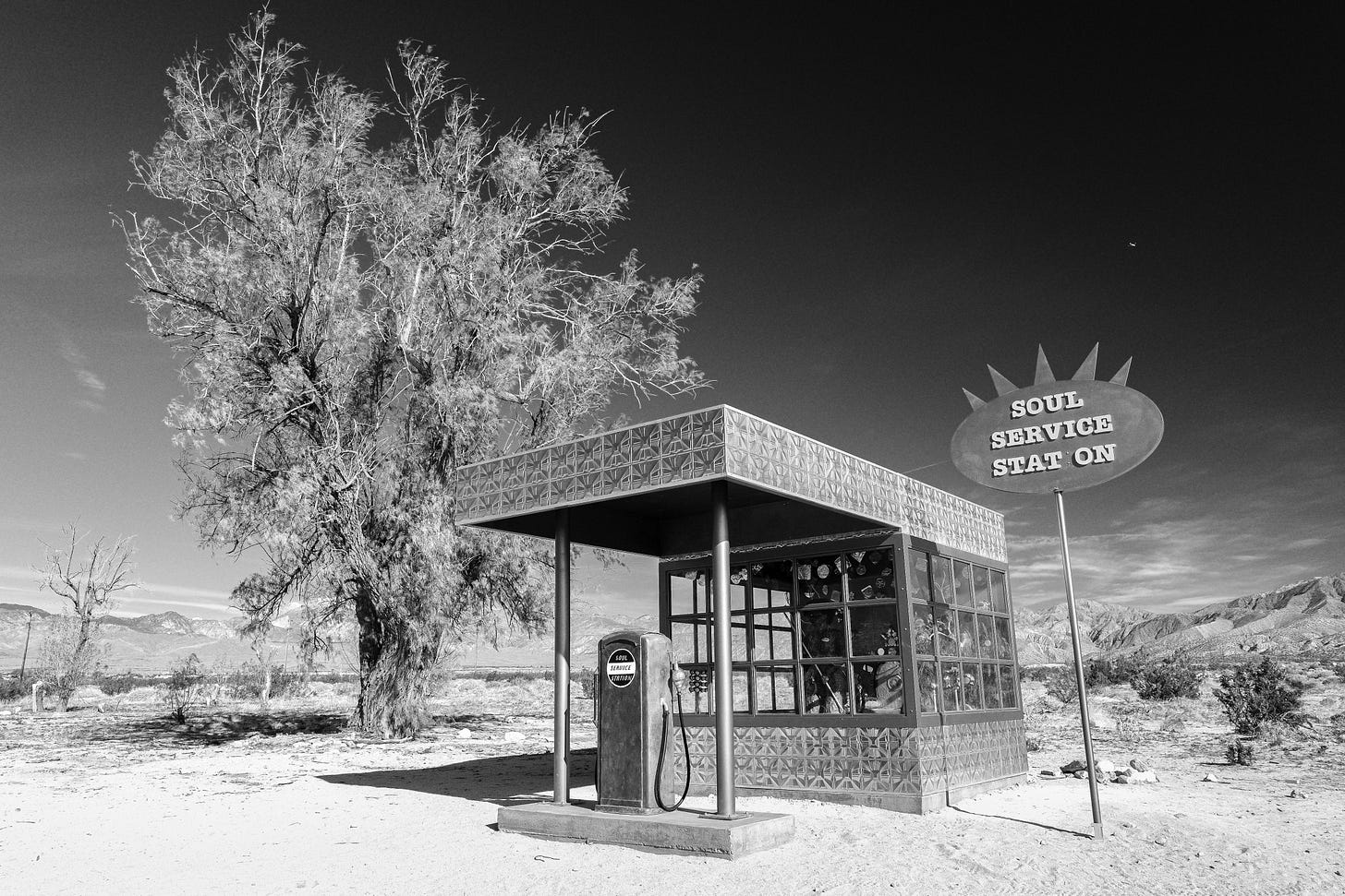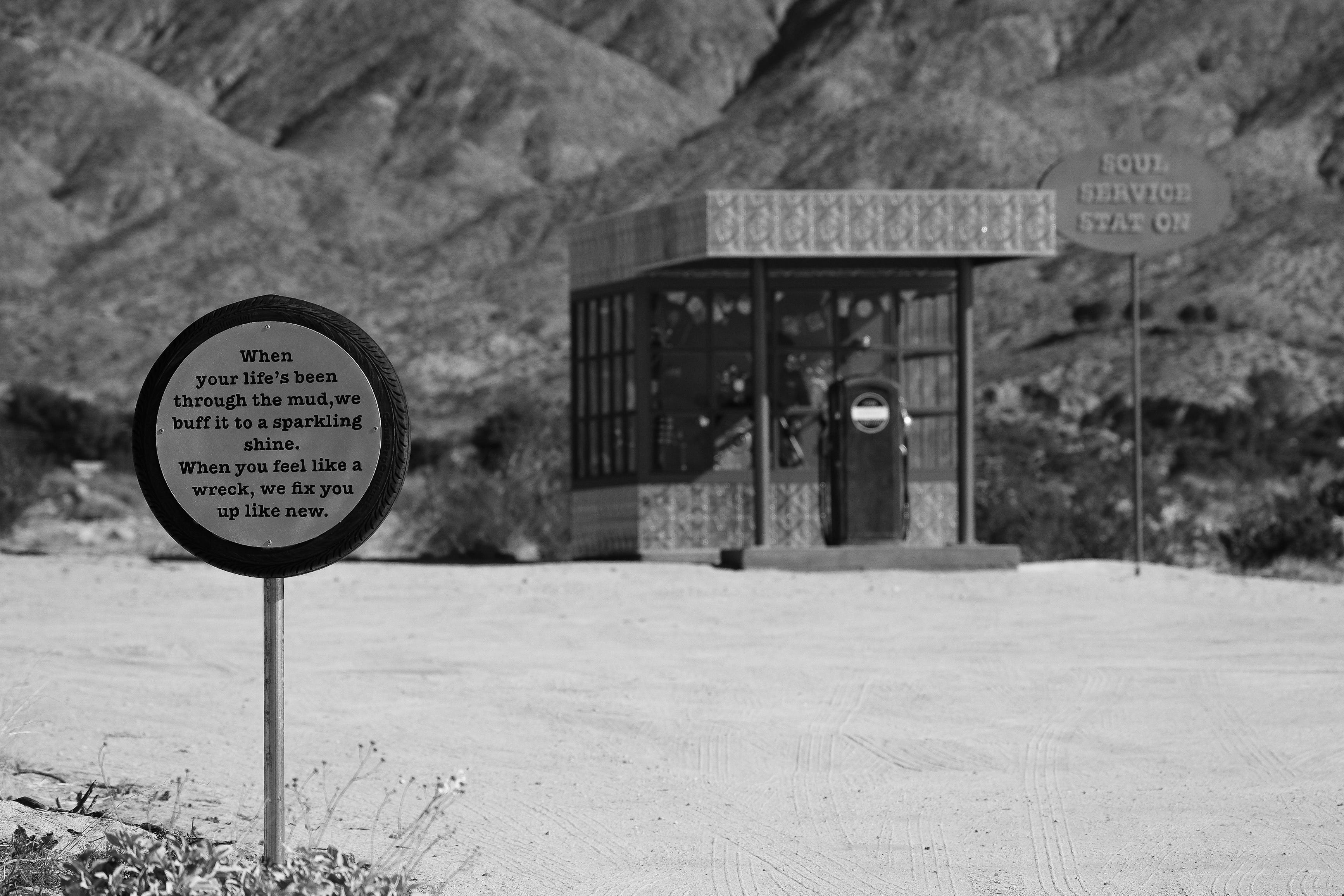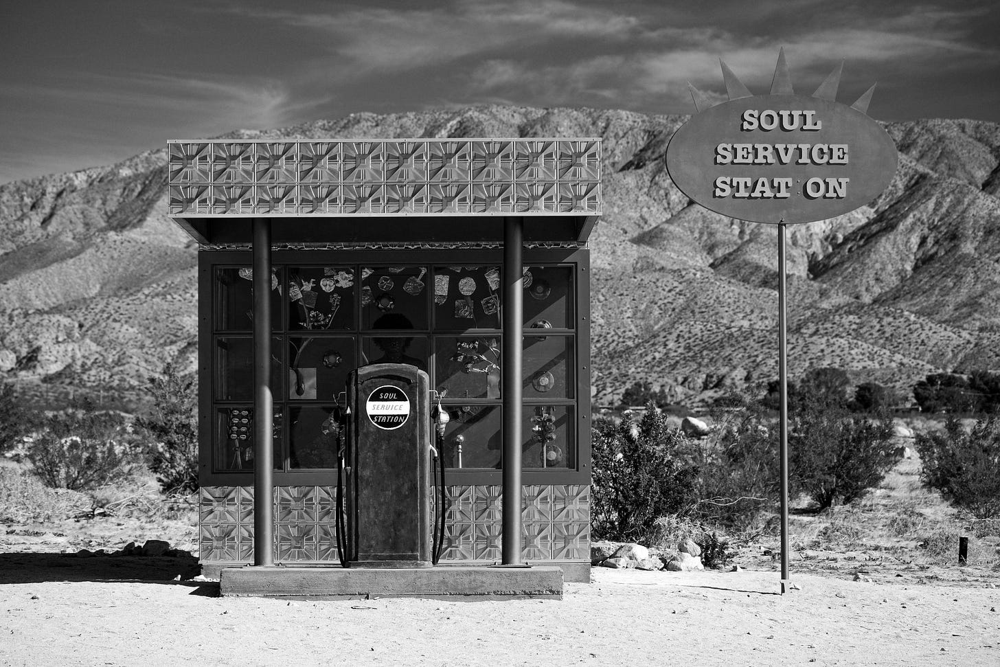 In Soul Service Station, Alison Saar reimagines the familiar gas stations of the American West as spaces of spiritual restoration. Rather than offering just practical services, Saar’s station provides emotional and cultural nourishment, inviting weary travelers to get “their blues flushed, spirits inflated, hearts charged, and souls filled.” Inside the station stands a life-size, hand-carved female figure who serves as both guardian and healer, embodying strength and protection. The installation becomes a sanctuary—a place for reflection, healing, and the honoring of collective histories and aspirations. Saar’s broader artistic practice is rooted in weaving personal and cultural narratives, drawing from spiritual traditions, mythology, and African histories.