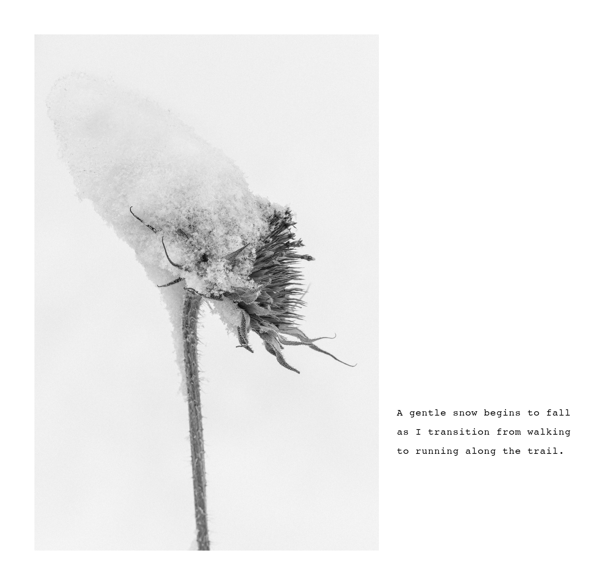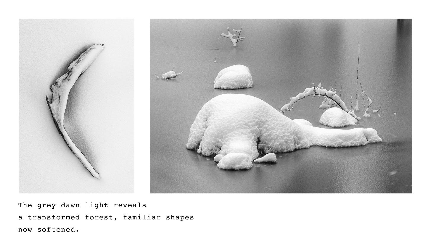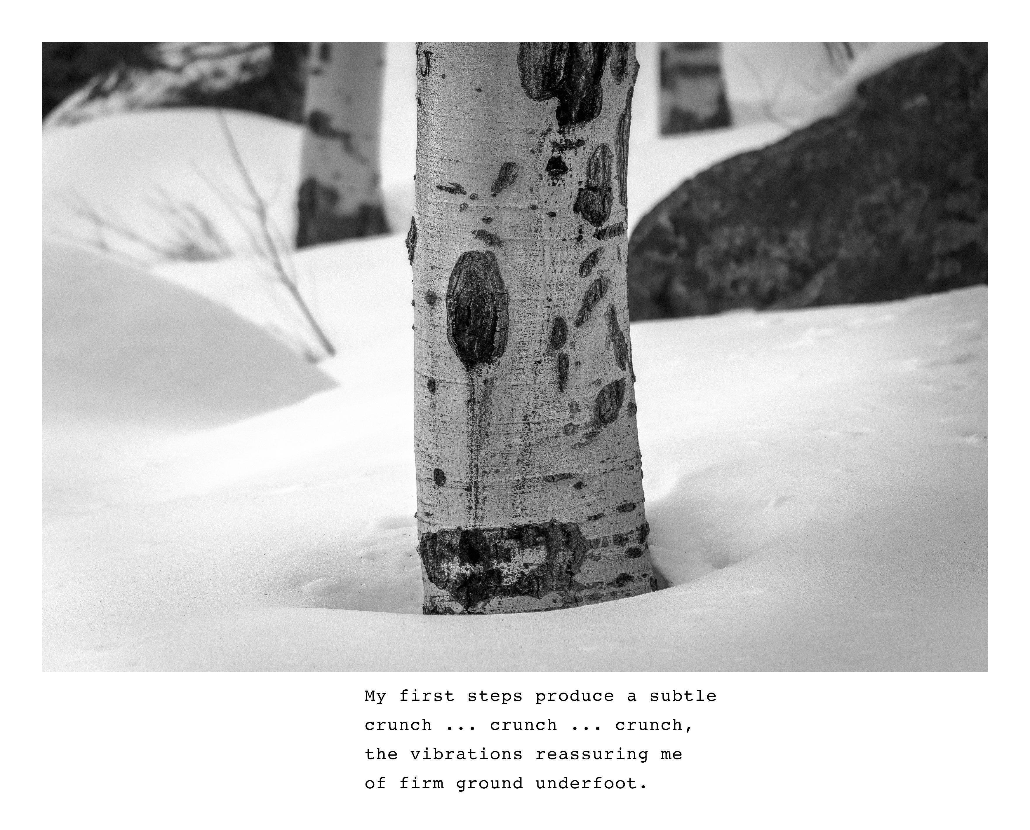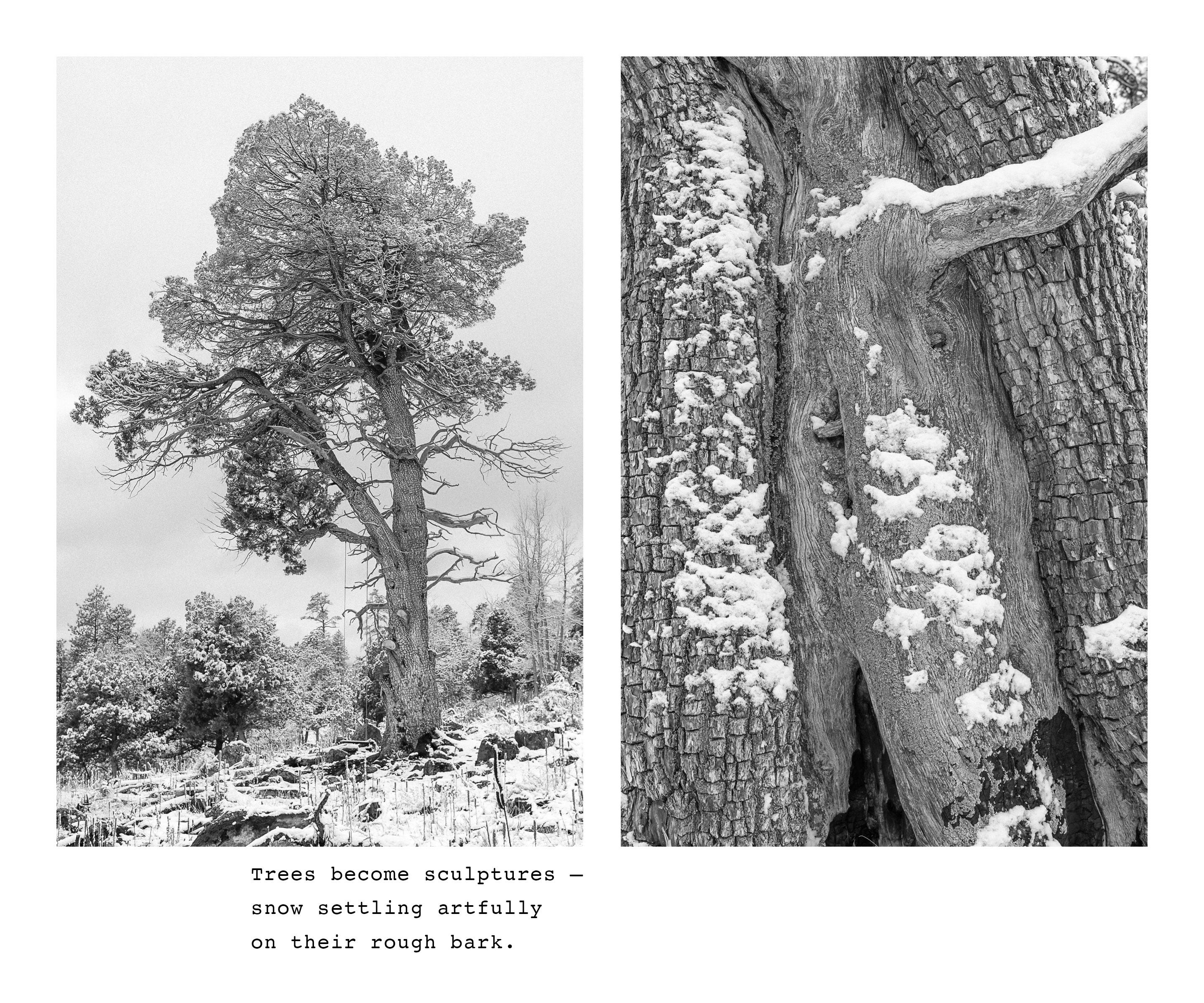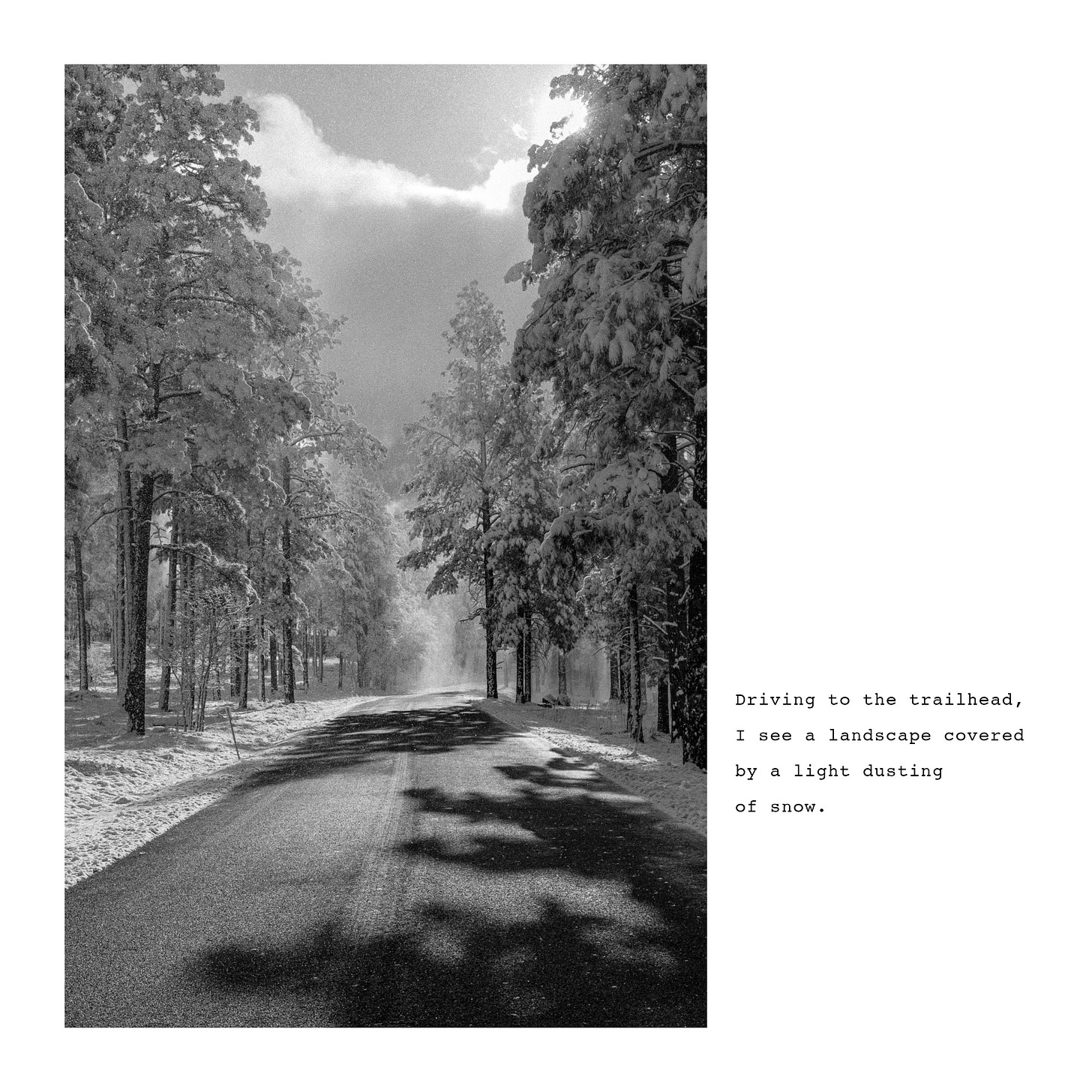 I try to begin each day in nature, hiking or running the forest trails near my house with my dog. A few weeks ago, while running along the trail on a snowy morning, the beauty of the forest inspired me to write a short essay about the experience. I’ve illustrated the essay with images from various Southwest locations that capture the mood and sensory qualities I experienced that morning.