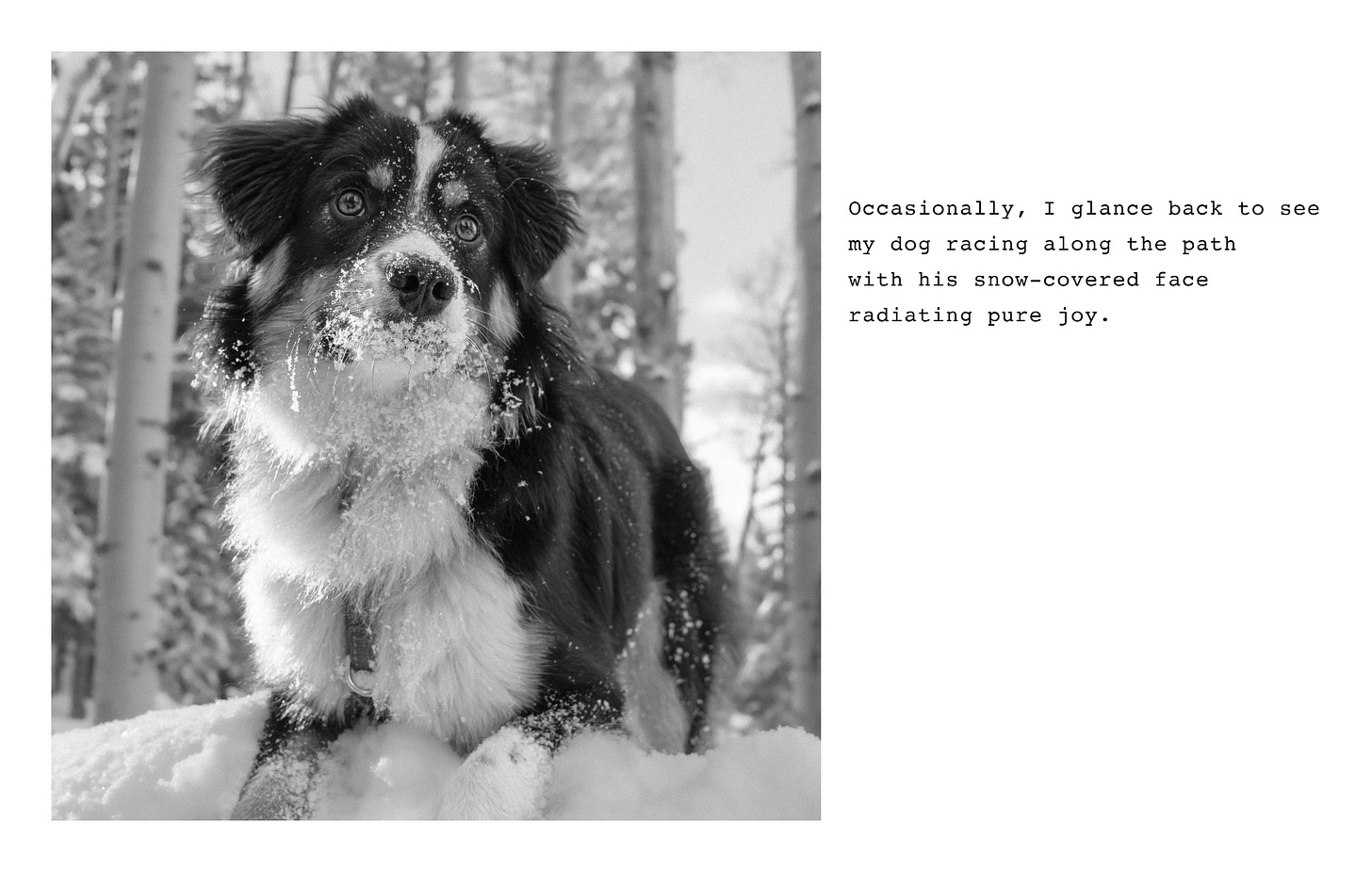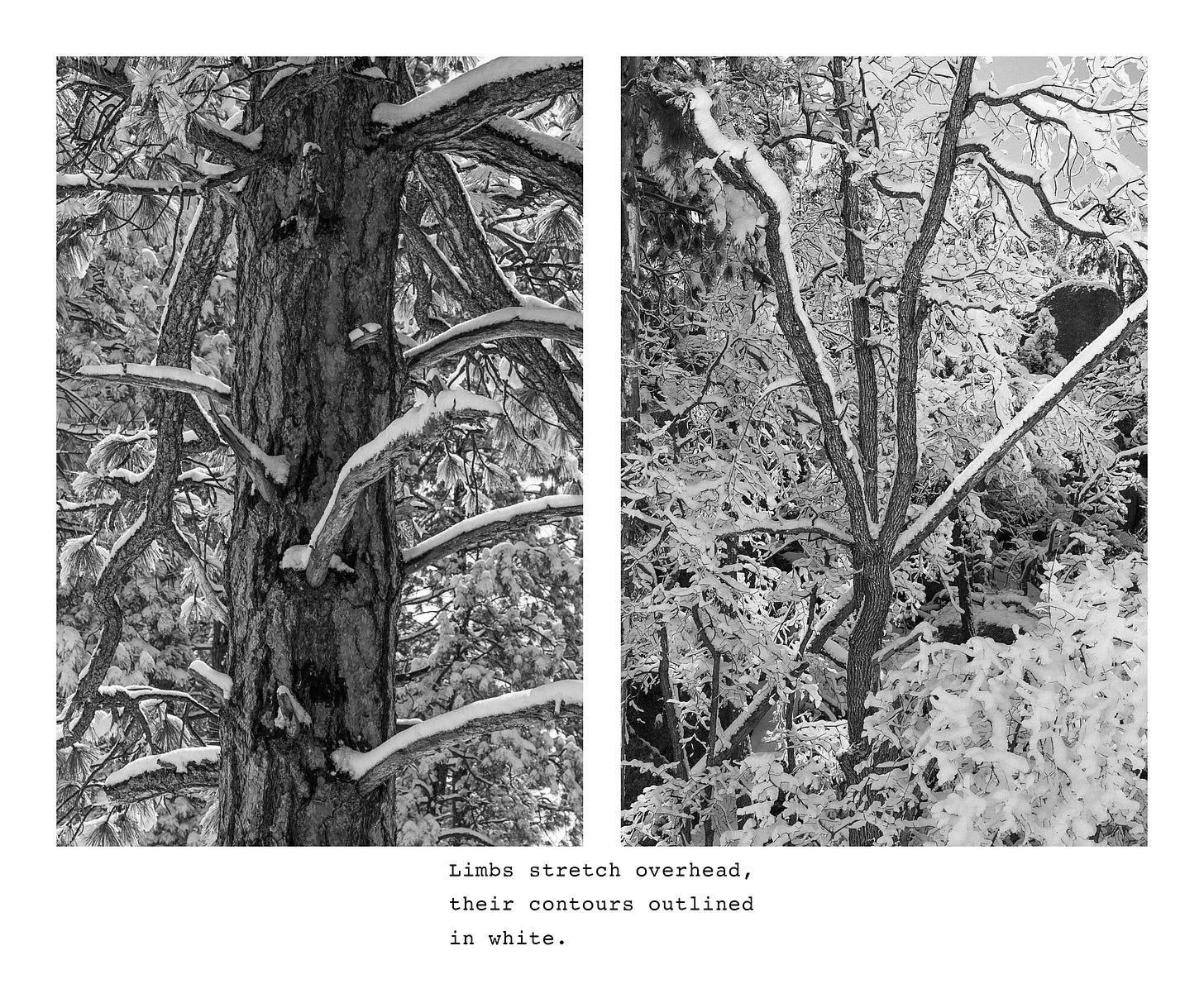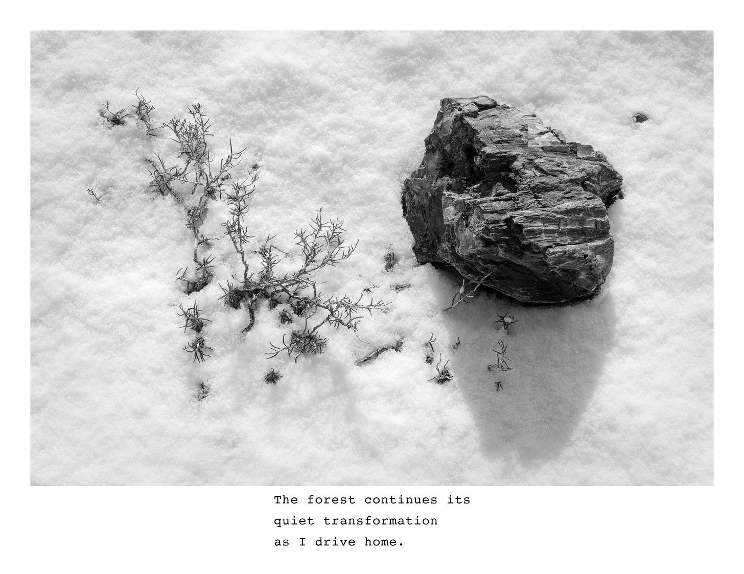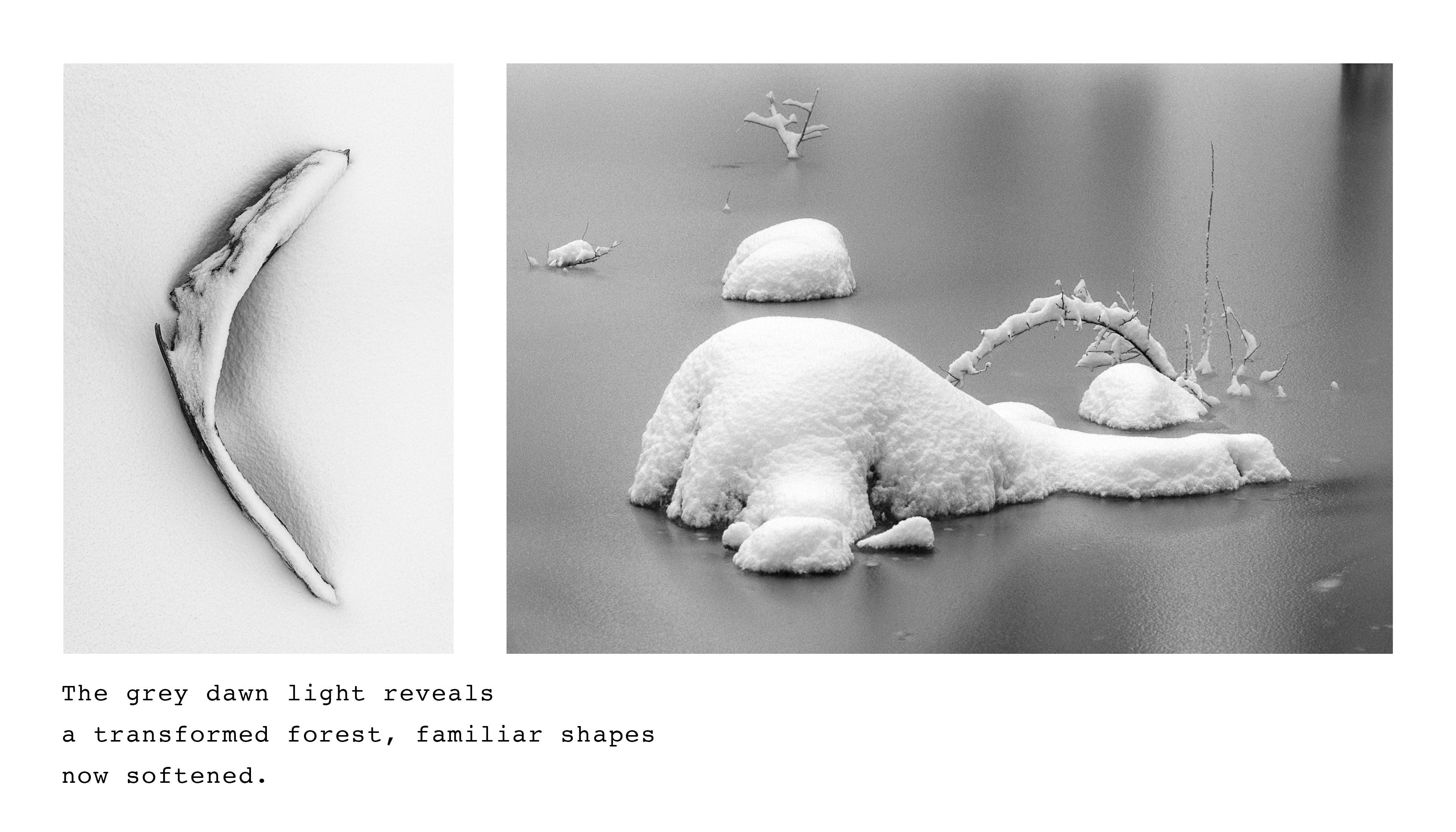 I try to begin each day in nature, hiking or running the forest trails near my house with my dog. A few weeks ago, while running along the trail on a snowy morning, the beauty of the forest inspired me to write a short essay about the experience. I’ve illustrated the essay with images from various Southwest locations that capture the mood and sensory qualities I experienced that morning.